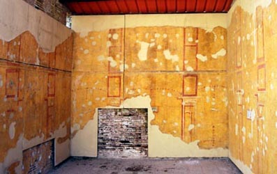 There were a few small painted areas covered in plexiglass to preserve them. Maybe a foot or two in size. There were a few rooms that still had something significant in size, and one room had a beautiful (remains of a) painting with sea creatures in it.