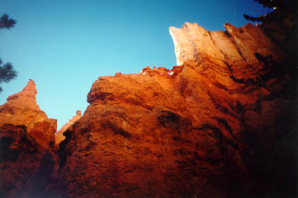 We hiked the Fairyland Loop Trail on our 1997 vacation. It was a day hike that covered 8 miles from the rim to the canyon floor and then back to the rim again. It was November, so the temperatures were below what many people might find comfortable. Several seasons of New England ice climbing enabled us to appreciate this, however. Though long sleeves and pants were required, we did not need a lot of extra clothing while hiking. When we stopped for lunch, however, we bundled up a bit more.